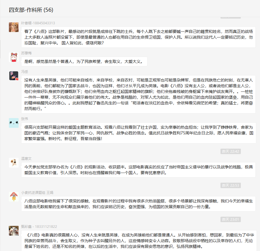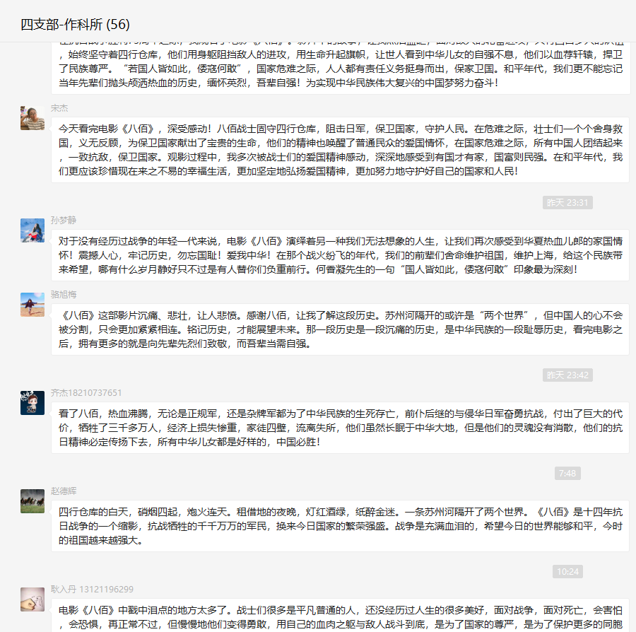 观影结束后,大家踊跃在支部群里交流观影心得,有党员同志在支部群里说到:“电影《八佰》中戳中泪点的地方太多了。战士们很多是平凡普通的人,还没经历过人生的很多美好,面对战争,面对死亡,会害怕,会恐惧,再正常不过,但慢慢地他们变得勇敢,用自己的血肉之躯与敌人战斗到底,是为了国家的尊严,是为了保护更多的同胞,牺牲了自己!因本身平凡而更伟大!“国人皆如此,倭寇何敢”,战士们的英勇也激发了对岸租界内普通民众的爱国热情,从开始她们一副事不关己的态度看着四行仓库,到后来都捐款捐物,投入到战斗。电影在战士们冒着枪林弹雨冲桥的时候戛然而止了,我们在电影院坐着久久没有起身,心情沉重。今日的幸福生活是千千万万个战士的血肉之躯换来的,来之不易,我们要珍惜,要为之努力奋斗。中华民族从来都是一个英雄伟大的民族,中华民族万岁!”。也有党员同志如是说道:“今天看完电影《八佰》,深受感动!八佰战士固守四行仓库,阻击日军,保卫国家,守护人民。在危难之际,壮士们一个个舍身救国,义无反顾,为保卫国家献出了宝贵的生命,他们的精神也唤醒了普通民众的爱国情怀,在国家危难之际,所有中国人团结起来,一致抗敌,保卫国家。观影过程中,我多次被战士们的爱国精神感动,深深地感受到有国才有家,国富则民强。在和平年代,我们更应该珍惜现在来之不易的幸福生活,更加坚定地弘扬爱国精神,更加努力地守护好自己的国家和人民!”。