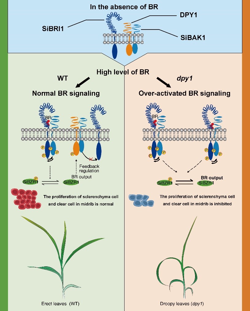 Recently, researchers from the Institute of Crop Sciences, Chinese Academy of Agricultural Sciences, together with their collaborators revealed that a new gene DROOPY LEAF1 (DPY1), can prevent Brassinosteroid (BR) signaling from overactivation in response to high doses of BRs, which in turn ensure that the leaf grow upward in Setaria . This study provides new insight into plant architecture regulation for cereal breeding. Related paper entitled “DROOPY LEAF1 Controls Leaf Architecture by Orchestrating Early Brassinosteroid Signaling” was published in PNAS on August 18, 2020 (https://doi.org/10.1073/pnas.2002278117).