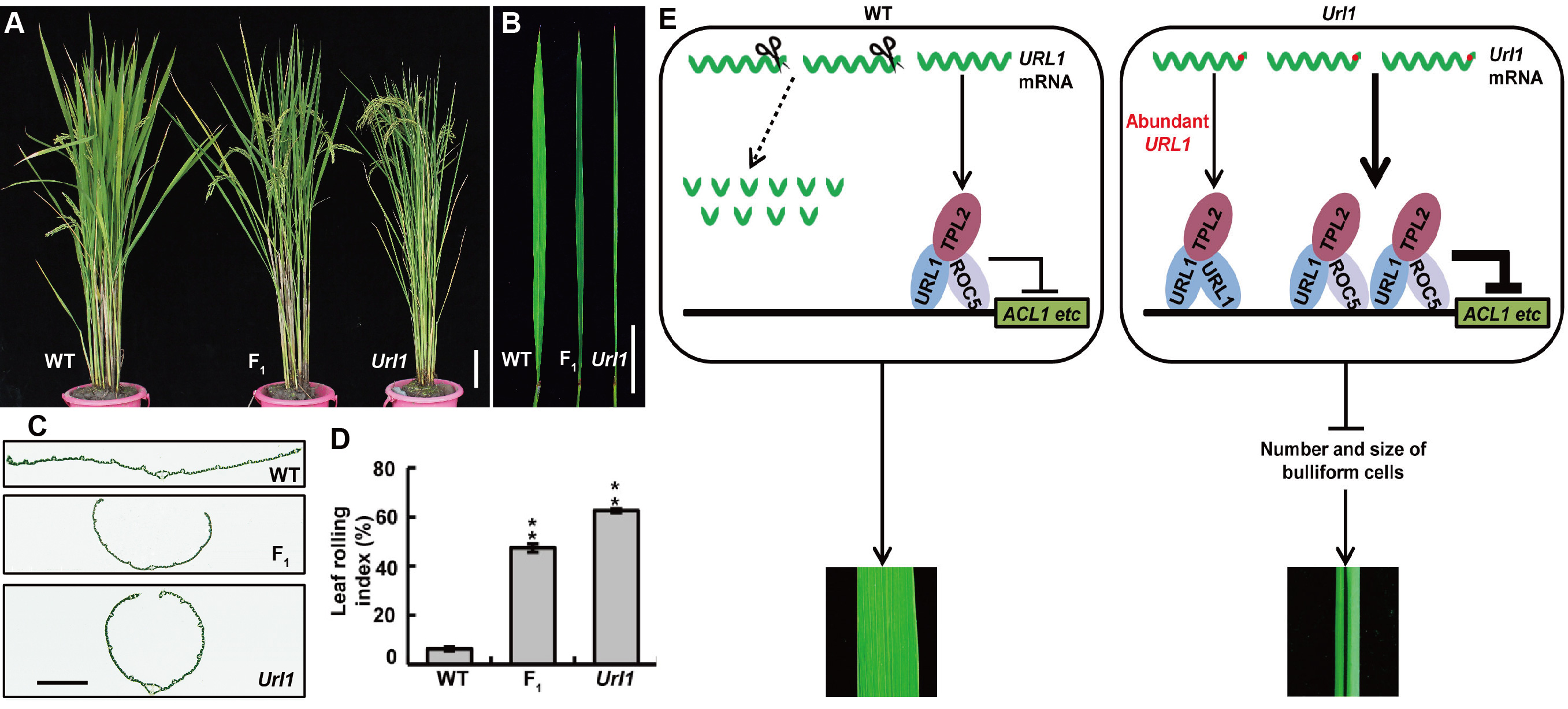 Url1突变体叶片内卷表型及URL1/ROC5/TPL2/ACL1分子模块调控水稻叶形模式图。