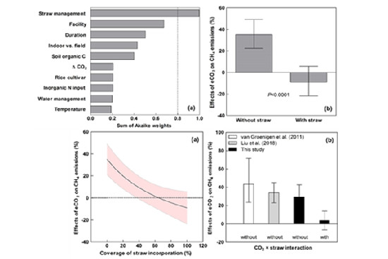 据作科所的张卫建研究员介绍,工业化革命以来,大气二氧化碳浓度已经升高了45%左右,并将继续升高。由于大气二氧化碳浓度升高显著促进水稻生长,可为稻田甲烷产生菌提供更多的碳源,因此,国际上普遍认为大气二氧化碳浓度升高将显著提高稻田甲烷排放,其增排幅度将达40%左右。但是通过一系列试验和综合分析,该团队发现大气二氧化碳浓度升高对稻田甲烷排放的影响取决于稻作技术,尤其是秸秆还田状况。当秸秆不还田时,大气二氧化碳浓度升高显著提高稻田甲烷排放;当秸秆还田时,大气二氧化碳浓度升高有降低稻田甲烷排放的趋势。而全球稻田秸秆还田的面积已经达到54%左右,我国稻田秸秆还田面积已经达到70%以上。结合秸秆还田状况,全球大气二氧化碳浓度升高的增排效应只有3.7%。