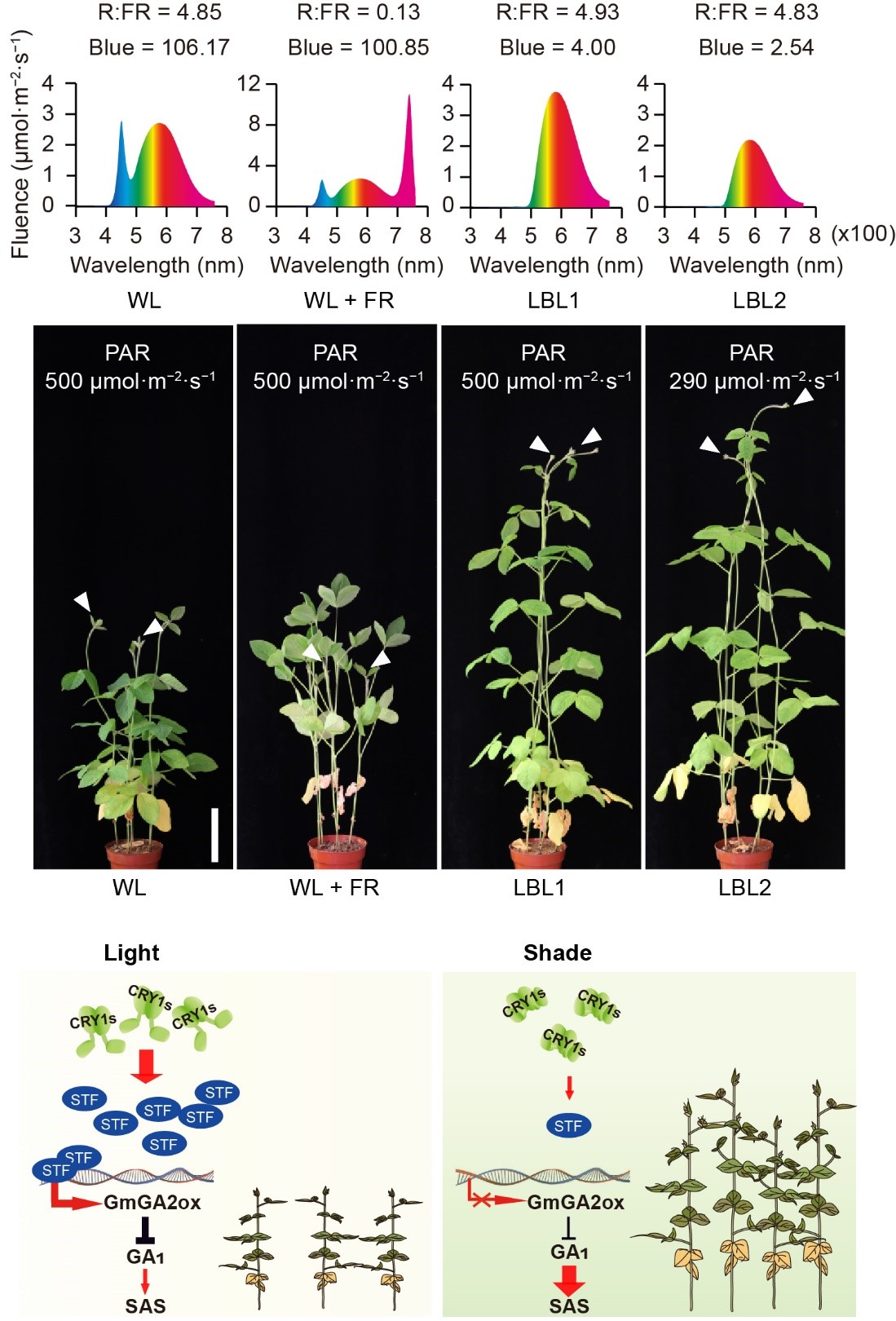 该团队通过研究发现,低红光/远红光显著诱导大豆叶夹角变小以及叶柄伸长,而弱蓝光主要促进茎秆伸长,明确了遮荫导致的蓝光水平下降是导致大豆倒伏的主要因素之一。研究人员利用基因编辑技术对大豆基因组编码的7个蓝光受体隐花素(GmCRYs)基因进行了敲除,结果表明,大豆隐花色素单突变体没有明显表型,但其中四个基因同时发生突变形成的 Gmcry1s 即使在正常光照条件下也表现出明显的茎秆徒长,表明 GmCRY1s 基因功能冗余并共同介导了弱蓝光依赖的避荫反应。进一步研究证实,被蓝光激活的GmCRY1s通过上调大豆转录因子STF的水平促进赤霉素氧化酶基因表达,从而降低内源赤霉素的含量并抑制大豆茎秆的伸长;而在弱蓝光条件下则反之。该团队创制的GmCRY1过表达大豆,可显著提高大豆耐荫性,实现密植条件下产量的提高。该研究对充分解析光环境调节大豆生长发育的调控网络具有重要科学意义。