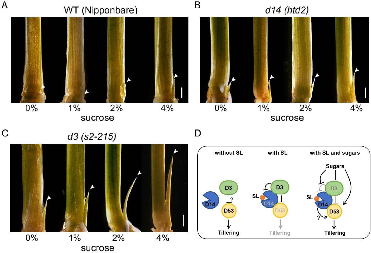 该研究发现蔗糖能够拮抗独脚金内酯对水稻分蘖的抑制作用。 在机制水平上,蔗糖促进独脚金内酯关键负调节因子D53蛋白的积累,并拮抗独脚金内酯诱导的D53蛋白的降解。蔗糖可以抑制编码泛素连接酶的 D3 基因的转录,而过表达 D3 可以解除高浓度蔗糖对D53蛋白的稳定作用和对分蘖的促进作用。蔗糖也能够阻止独脚金内酯诱导的D14蛋白的降解,过表达 D14 能够促进D53蛋白的积累和蔗糖诱导的分蘖。该研究在分子水平上揭示了蔗糖和独脚金内酯相互作用来调控分枝和分蘖的机理。
