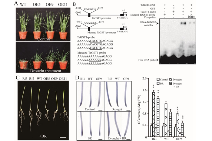 研究发现,过表达 TaBZR2 能够提高转基因小麦的抗旱性,而通过RNA干扰下调其表达的小麦植株抗旱性降低。进一步生化实验分析表明,TaBZR2通过激活谷胱甘肽巯基转移酶1的表达,清除体内超氧阴离子。研究人员还发现,TaBZR2是油菜素内酯(BR)信号通路的正向调节因子,外源BR处理增强了TaBZR2介导的超氧阴离子的清除和抗氧化酶活性;BR在清除超氧阴离子方面发挥重要作用。这些研究证明了TaBZR2在小麦干旱响应中发挥重要作用,并参与BR介导的干旱胁迫响应。该成果为深入理解小麦干旱响应的调控网络,创制抗旱节水小麦提供科学依据。