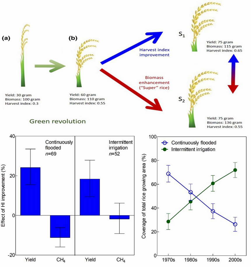 水稻是世界第二大口粮作物,稻田是全球甲烷(CH4)最主要的人为排放源,水稻增产与稻田减排同等重要。从生物学上讲,水稻高产途径有两条:提高生物学产量和提高收获指数。至今,对于不同途径对稻田CH4排放的影响尚无定论。