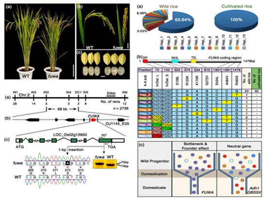 万建民领导的作物功能基因组学创新团队以水稻宽粒和直立穗突变体fuwa为材料,通过图位克隆的方法鉴定分离了一个水稻粒型和穗型的关键调控因子FUWA。该基因编码一个含有NHL结构域的未知功能蛋白,该结构域的功能在植物中未见报道。研究发现,FUWA主要在穗原基和小花原基部位表达,通过负调控细胞分裂影响稻穗的生长发育。对125份来自16个不同地区水稻品种的FUWA编码区的测序和遗传多样性分析结果表明,FUWA基因在这些资源中高度保守。在所测的普通野生稻中一共存在13种FUWA氨基酸单倍型,而受瓶颈效应影响,栽培中只包含一种单倍型(Hap_1)。遗传转化实验结果表明,普通野生稻中的13种单倍型以及玉米高粱中的FUWA同源基因都可以恢复fuwa突变体的表型,表明fuwa是一个自然界中暂未发现的新的遗传变异资源且FUWA同源基因在其他禾本科植物中行使类似的调控细胞分裂的功能。