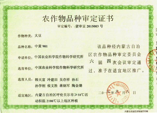 2015年6月8日,中国农业科学院作物科学研究所培育的大豆新品种中黄901正式通过内蒙古自治区农作物品种审定委员会审定,成为我所“大豆育种技术创新与新品种选育”创新团队面向东北北部大豆主产区选育的第一个大豆品种,使我所大豆品种的适宜种植区域向北推进近1000公里,达到北纬50o。