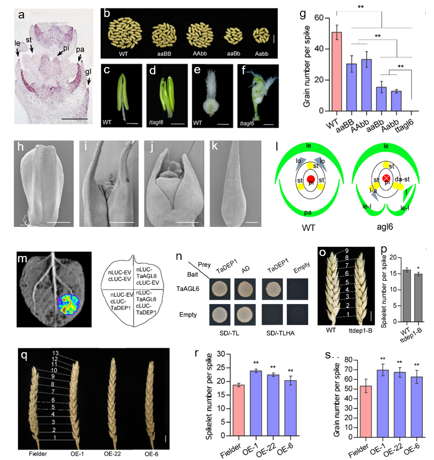 该研究发现,TaAGL6基因在包括内稃、浆片、雄蕊和雌蕊在内的四轮花器官中均发挥功能,并以剂量效应的方式影响穗粒数, agl6的纯合突变体完全不育。此外,该研究还证明了TaAGL6能与G蛋白信号路径上的亚基互作,可能以蛋白复合体的形式参与小穗发育。该文系统研究了AGL6在小麦花器官和小穗发育中的功能及其调控机制,并通过调控AGL6表达实现了增加小穗数和穗粒数,为小麦高产育种提供了参考。