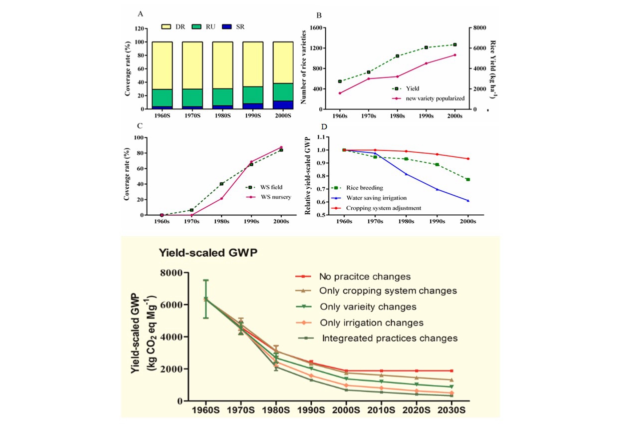 研究团队通过多年的大样本品种比较、田间定位监测、区域调研和历史数据挖掘,综合评价了近50年来我国品种更新、栽培创新和稻作制调整等对水稻产量和稻田温室气体排放的影响。研究发现,通过稻作北移、高产品种和控水增氧耕作等创新,在实现水稻单产提高130%情况下,稻田温室气体排放下降约70%,其中甲烷减排尤为显著。该成果不仅在国际上给我国水稻产业正名,而且为全球高产低碳稻作创新指明了方向,可为世界作物生产应对气候变化提供理论参考和技术借鉴。