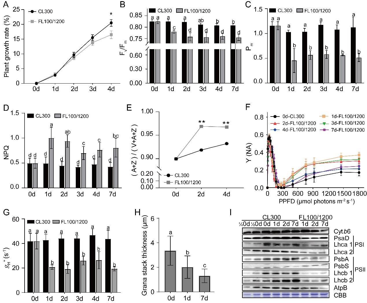 研究人员通过比较短期和长期波动光处理水稻植株,发现长期波动光处理降低了水稻植株的株高和生长速率。短期波动光处理主要抑制光系统I活性,而光系统II由于受到非光化学淬灭的保护受影响较小。随着波动光处理时间的延长,叶黄素循环组分玉米黄质大量积累,类囊体腔侧的酸化程度增加,诱导较高的非光化学淬灭。长期波动光处理使光系统I受体侧限制增加,而非光化学淬灭的增加降低了光系统II的效率,电子传递速率在光系统I和II均下降,表明长期波动光处理使两者活性均受到抑制。进一步研究表明,长期波动光处理使气孔开度减小,从而使气孔导度下降,进一步限制了CO2的同化,最终导致水稻生长受到抑制。