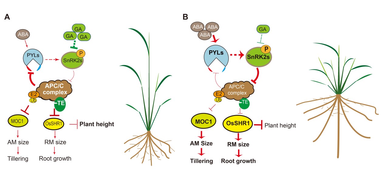 水稻株型是与产量密切相关的重要农艺性状,受到极其复杂的分子网络的调控,迄今仍有诸多未解之谜。该团队早期研究发现,水稻分蘖抑制基因Tiller Enhancer (TE)编码APC/CTE E3泛素连接酶复合体的一个激活子,能够通过介导水稻分蘖关键促进因子MOC1的降解,进而抑制水稻的分蘖(Nature Communications, 2012)。且TE通过介导脱落酸受体PYL/PYR/RCAR的降解,来介导赤霉素对脱落酸信号途径的拮抗(Nature Communications, 2015)。另外,现有研究已经清楚,脱落酸是一种胁迫反应植物激素,它通过抑制种子萌芽及幼苗生长来适应不利的环境条件,而赤霉素是一种重要的促生长植物激素,可促进种子萌发、幼苗生长、开花和叶片伸展,尽管赤霉素和脱落酸拮抗调控植物的许多生长发育过程,但是赤霉素和脱落酸如何拮抗调控根发育和植物分枝(分蘖)的分子机制仍不清楚。