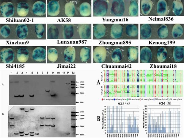 作物转基因技术与应用创新团队通过改进小麦遗传转化技术,构建双T-DNA表达载体,建立了利用商业化小麦品种获得无筛选标记转基因小麦植株的技术体系,获得率达4.3%。另外,针对表达载体上的35S启动子在转基因小麦中容易发生甲基化,导致转入基因沉默率偏高的问题,研究人员提出了降低甲基化和克服基因沉默的策略。利用上述技术体系,研究人员成功转化济麦22、矮抗58、郑麦7698、周麦18、扬麦16、内麦836、西农979、川麦42、科农199、石4185、师栾02-1、冀麦5265、中麦895、轮选987等我国多个大面积推广的小麦品种,转化效率达到2.9-22.7%。该技术体系的建立,为实现重要功能基因向优良小麦品种转化以及小麦转基因新品系培育奠定了基础。
