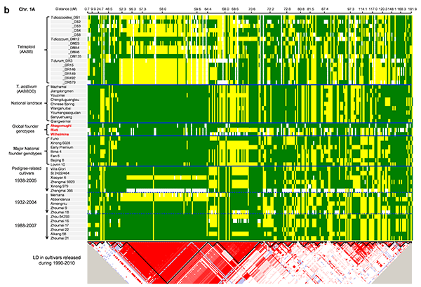 普通小麦是异源六倍体,经历了从二倍体到四倍体(四倍体化)和四倍体到六倍体(六倍体化)两次多倍体化事件。利用9K SNP芯片(全部位于基因编码区)对小麦及其近缘种基因型分析后发现多倍体化对基因和基因组的冲击远大于驯化和遗传改良。整体而言,现代品种基因的多样性较地方品种更高,这与以往的认识是相矛盾的。造成这种现象的原因是小麦作为严格的自花授粉作物,在先民驯化、种植和选择过程中积累了大量的变异,但这些变异主要集中在基因间区和调控区,现代育种(人工杂交)促进了不同群体间基因的交流和有效重组,提高了基因的多样性。研究还发现驯化和育种对A基因组的选择明显强于B基因组,前者单元型区段数量少、但遗传跨度大,连锁不平衡更明显,A基因组拥有更多与产量性状显著关联的位点或区段,因此,提出小麦基因组进化过程中存在明显的非对称性。这项研究为海量SNP数据分析提供了参考和思路。