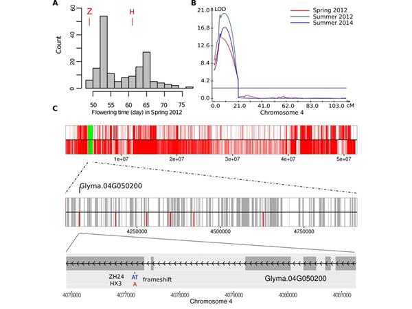 研究人员通过构建以“中黄24”(常规品种) 和“华夏3号”(长童期品种) 为亲本的重组近交系群体,采用RAD-Seq技术构建遗传图谱,进行连锁分析并结合亲本全基因组重测序,将长童期性状定位到GmELF3基因上。在长童期品种“华夏3号”中,该基因缺失了一个碱基,导致基因序列移码和所编码的蛋白失活,从而延迟开花,产生了长童期性状。将来自“中黄24”的GmELF3基因转入“华夏3号”能够实现功能互补,使“华夏3号”开花提早,从而进一步证明GmELF3突变导致长童期性状的产生。J基因的克隆是我国科学家在大豆光周期反应这一重要研究领域独立完成的突破性成果,为将中高纬度地区的优良大豆品种改造成可在热带亚热带地区种植的材料提供了可靠的技术途径,对拓展大豆品种种植区域、发展低纬度地区大豆生产具有重大意义。