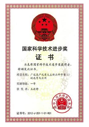 中共中央、国务院1月18日在北京人民大会堂隆重举行2012年度国家科学技术奖励大会,我所王连铮“广适高产优质大豆新品种中黄13的选育与应用”研究项目成果荣获2012年度国家科技进步一等奖。该项目主要研究成果包括:1、提出了不同纬度与遗传远缘的亲本杂交培育广适大豆的育种新方法,创建了广适高产大豆育种技术体系,创制广适新种质6份。2、培育出广适高产优质大豆新品种中黄13,实现了大豆育种新突破。该品种主要特点:①适应性广。先后通过国家及9个省市审定,适宜种植区域从29°N~42°N,跨三个生态区13 个纬度,是迄今国内纬度跨度最大、适应范围最广的大豆品种。中黄13光周期钝感,蓝光受体基因(GmCRY1a)研究结果揭示了其适应性广的分子机理。②高产。在黄淮海地区创亩产312.4 kg 的大豆高产纪录。③优质。蛋白质含量高达45.8%,籽粒大,商品品质好。3、建立了中黄13 育繁推一体化推广体系,实现了14个省市大面积推广应用,累计推广面积5520万亩,社会经济效益55.4亿元。该品种连续4年全国年种植面积排名第一,是近16年来唯一年推广面积超千万亩的大豆品种。
