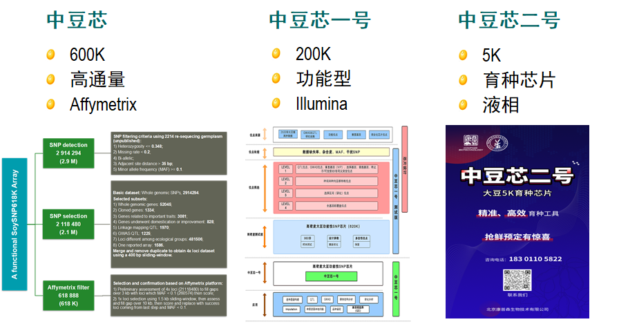 据介绍,“中豆芯”系列基因芯片是在2000余份大豆核心种质全基因组数据的基础上,选取代表性位点,纳入已克隆的重要性状功能基因和QTL位点等信息,经过3代更迭打磨而成“中豆芯”系列大豆基因芯片,可广泛应用于新基因发掘、分子进化分析、分子身份证构建、真假杂交种鉴定、定向改良育种、聚合育种、全基因组选择育种等领域。