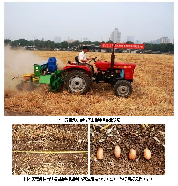 与会人员在现场看到,两台麦茬免耕覆秸精量播种机正在田间作业,其中一台只播种大豆,另一台同时播种大豆、玉米和花生。在麦秸近40厘米高的原茬地上,播种机先将秸秆和部分根茬抛撒在机具的一侧,待返程作业时,又将被抛撒出的麦秸拨回,使其均匀地覆盖在刚刚播完的地方,机具一次进地即可完成种床整备、侧深施肥、精密播种、覆土、镇压、覆秸等多重工序。扒开播后的土层可以看到,一粒粒种子整齐地点播在5厘米深处的种沟中,粒距均匀,深度一致,完好无损。在种子侧下5厘米深处,则会看到播撒在土壤里的种肥。