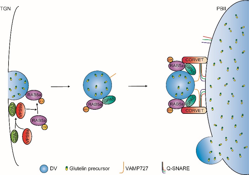 该团队发现了一个新的谷蛋白后高尔基体分选缺陷突变体 gpa5 ,通过图位克隆的方法证实 GPA5 编码一个具有磷脂结合能力的植物特有调控因子。在胚乳细胞中,GPA5特异分布在致密囊泡外围。亚细胞定位分析证实GPA5的膜定位依赖于前期鉴定的调控因子GPA1/Rab5a和GPA2/VPS9a。生化分析进一步证实GPA5可特异与GPA1/Rab5a的激活形式互作,表明GPA5可能是GPA1/Rab5a的效应因子。后续的功能研究发现,GPA5可与栓系复合体CORVET和含有VAMP727的膜融合复合体SNARE互作来最终介导致密囊泡与蛋白贮藏液泡的融合,以完成谷蛋白的转运。