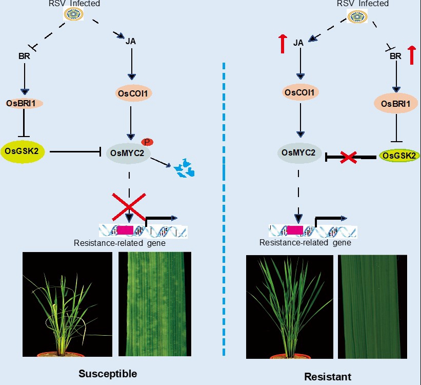 该团队研究发现增加外源或内源油菜素类固醇和茉莉酸及增强两种激素的信号途径均可显著提高水稻对条纹叶枯病的抗性;相反,油菜素类固醇或茉莉酸信号受阻时,水稻更易感病。进一步研究发现,条纹叶枯病毒侵染水稻可以显著抑制植株内源性油菜素类固醇的合成,进而增加其信号途径关键负调控因子OsGSK2的积累。通过实验证实OsGSK2可以与茉莉酸途径的关键正调控因子互作,通过磷酸化使其降解,从而降低了油菜素类固醇增强的条纹叶枯病抗性,表明油菜素类固醇介导的条纹叶枯病抗性依赖于茉莉酸途径。上述研究揭示了病毒通过作用于类固醇途径,进而抑制茉莉酸介导的条纹叶枯病抗性的分子机制,加深了我们对病毒与寄主相互作用的认识,为利用分子育种技术培育抗性品种提出了新策略。