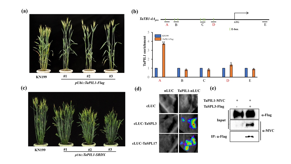 该研究发现,在小麦中增加转录因子基因 PIL1 表达可显著降低分蘖数和增加株高;相反,过表达人工融合转录因子 PIL1-SRDX 可以显著增加小麦分蘖数和降低株高。深入研究发现,在过表达 PIL1 基因的植株中,分蘖控制基因 TB1 的表达升高;而在 PIL1-SRDX 转基因植株中, TB1 基因的表达受到抑制。进一步通过试验证明了PIL1能够在转录水平激活 TB1 的表达。以上结果揭示了PIL1可能通过激活 TB1 基因的转录表达实现对小麦株型的调控。同时,在水稻中的研究也证实了PIL11可以通过影响 TB1 基因的表达来调控水稻株型。