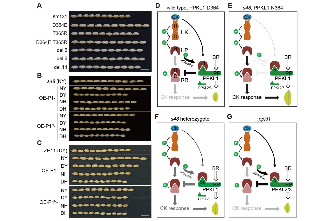 研究人员通过大规模诱变,筛选到一个大粒显性突变体并克隆了突变体基因 PPKL1 。与RR蛋白类似,PPKL1可与AHP2蛋白直接互作,并通过模仿RR蛋白功能区与其竞争AHP2的磷酸基团,导致磷酸中继效率大幅降低。当此功能区位点突变后则丧失了对信号传递的影响,相应地籽粒显著增大。研究人员以优质水稻品种空育131为材料,针对该功能区进行基因编辑,获得多个可不同程度增大籽粒的基因型,部分可显著增产。该研究中研究人员共创制了千粒重从20g到38g渐次分布的水稻材料,从而建立了一套水稻籽粒大小精准设计系统。PPKL家族蛋白对细胞分裂素信号的抑制作用可能是一个古老的功能,其功能位点隐藏在甾醇类激素油菜素内酯信号组分中,发掘并利用其对作物进行分子设计改良具有重大应用价值。