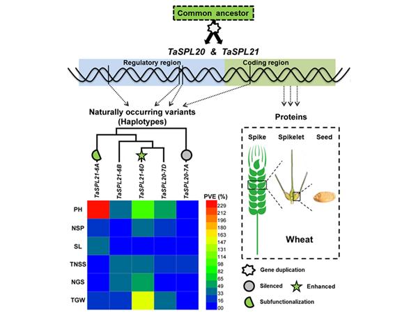 近日,中国农业科学院作物科学研究所作物基因资源发掘与利用创新团队在《Plant Physiology》杂志上发表了题为“Functional conservation and divergence among homoeologs of TaSPL20 and TaSPL21, two SBP-box genes governing yield-related traits in hexaploid wheat”的研究论文,发现普通小麦部分同源基因TaSPL20和TaSPL21在小麦长期的驯化和遗传改良过程中产生功能分化,其优异的自然变异在我国小麦育种进程中受到了定向选择并被广泛应用。