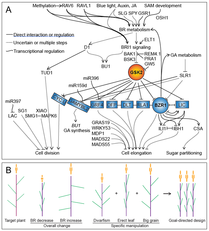 油菜素内酯控制着水稻叶夹角、株高、粒型等多个重要农艺性状,在农业生物技术上具有重要应用潜力。但由于不同性状之间的关联性,目前利用油菜素内酯对作物进行改良存在局限性。水稻中的一系列研究表明,此激素在不同环境下对不同性状的控制在下游具有相对特异的信号通路,例如,油菜素内酯通过控制赤霉素代谢来调控水稻株高,而通过调控OsGRF4功能调控水稻粒长,并且不同水平的油菜素内酯对水稻不同组织的生长发育具有不同甚至相反的调控功能。在分子水平上,这种特异性通常是由激素信号负调控子的不同底物或转录因子的不同靶标来介导的,这些底物或靶标之间存在复杂的相互作用,既相对特异,又相互作用,或协同或拮抗或竞争,从而调控油菜素内酯多种多样的功能。鉴定相应通路的特异组分可用于对某一性状进行定向改造而避免其它负效应,从而提高分子设计效率,辅助分子设计育种。