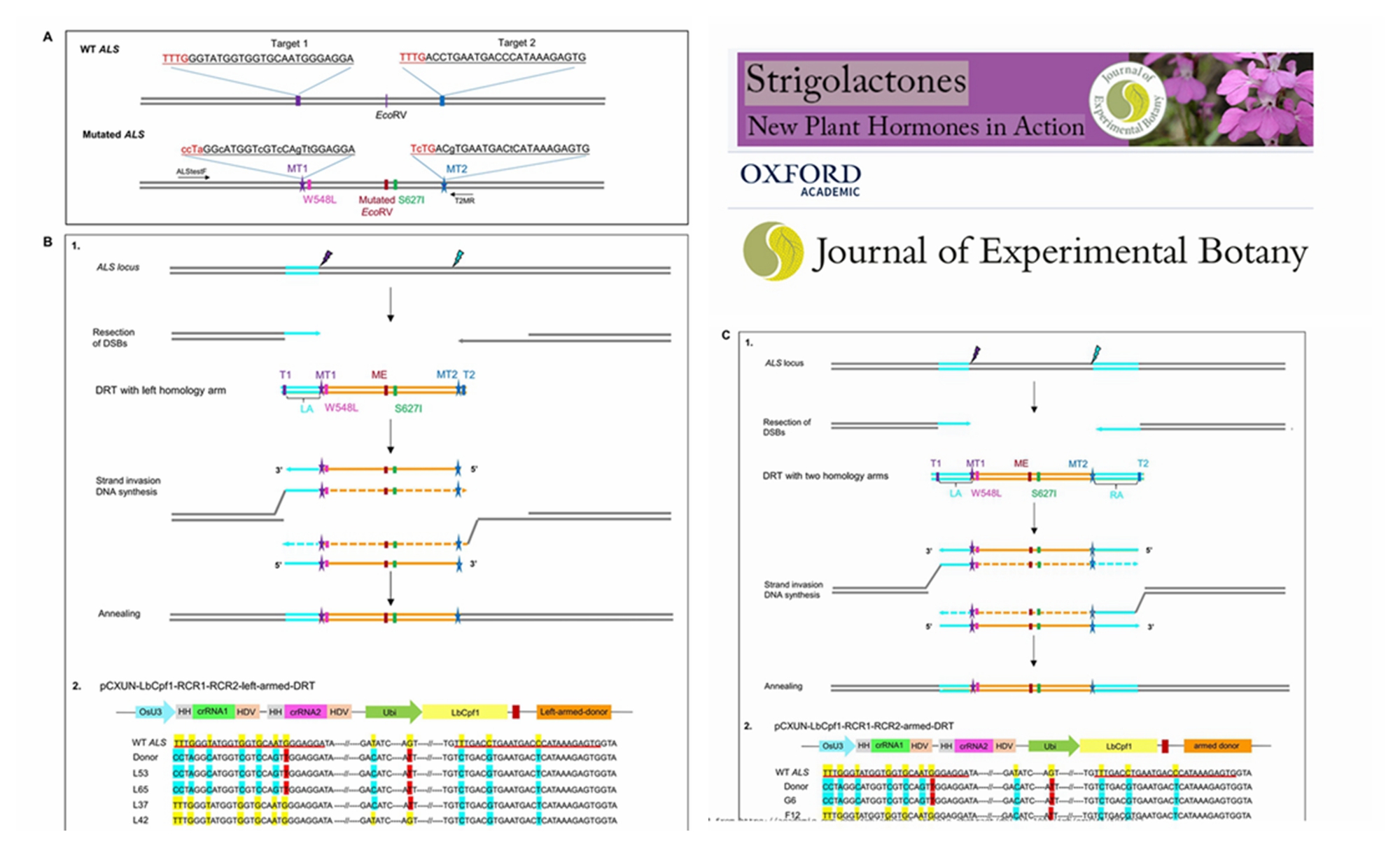 日前,中国农业科学院作物科学研究所夏兰琴实验室与美国加州大学圣地亚哥分校赵云德教授实验室合作,揭示了Cpf1介导的同源重组修复途径(homology-directed DNA repair, 简称HDR)实现农作物基因替换的修复机制,并在水稻中成功实现乙酰乳酸合成酶(Acetolactate Synthase, 简称ALS)基因的等位基因替换,获得抗除草剂水稻。相关研究论文在 Journal of Experimental Botany 杂志上于6月28日在线发表。