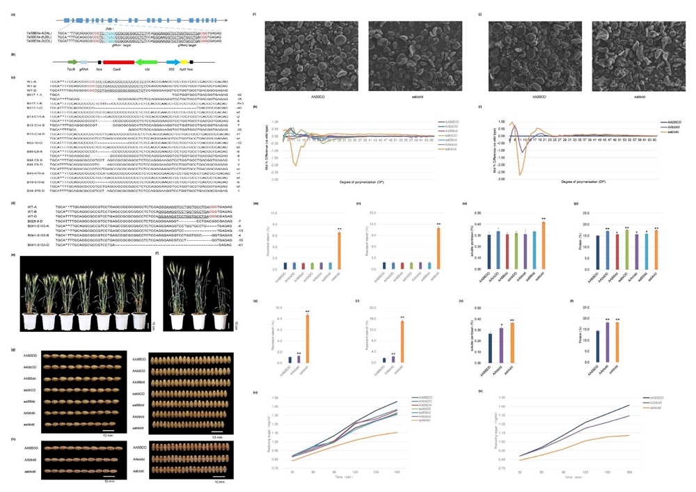 淀粉分支酶是直接参与支链淀粉生物合成的关键酶,研究表明抑制小麦 SBEIIa 基因的表达可显著提高直链淀粉含量。该研究利用CRISPR/Cas9基因编辑技术,在冬小麦郑麦7698和春小麦Bobwhite两个品种中定点编辑 SBEIIa 基因,经过后代分离筛选,成功获得郑麦7698系列无转基因突变体,包括 AAbbDD 、 AABBdd 、 aabbDD 、 AAbbdd 、 aaBBdd 和 aabbdd ,在春小麦Bobwhite中获得了无转基因 AAbbdd 和 aabbdd 两个突变体。分析发现 SBEIIa 基因编辑具有剂量叠加效应,其中,两个品种 aabbdd 三缺失突变体和Bobwhite的 AAbbdd 突变体显著影响淀粉颗粒大小和形态、支链淀粉的精细结构、淀粉的理化和营养特性。 aabbdd 三缺失突变体的直链淀粉、抗性淀粉、可溶性戊聚糖和蛋白质含量显著增加。消化后,还原糖含量显著降低,说明创制的高直链淀粉小麦具有潜在的营养保健功能。该研究结果为进一步通过基因组编辑技术,提高谷类作物抗性淀粉含量提供了依据。
