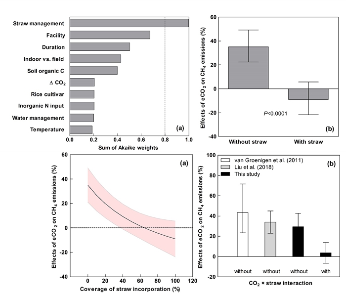 研究团队通过一系列试验和综合分析发现eCO2对稻田CH4排放的影响取决于稻作技术,尤其是秸秆还田状况。当秸秆不还田时,eCO2显著提高稻田甲烷排放;当秸秆还田时,eCO2有降低稻田CH4排放的趋势。全球稻田秸秆还田的面积已经达到54%左右,我国稻田秸秆还田面积已经达到70%以上。结合秸秆还田状况,全球eCO2的增排效应只有3.7%。本研究可为全球稻田甲烷排放预测,以及低碳排放的稻作技术创新提供重要的理论依据。