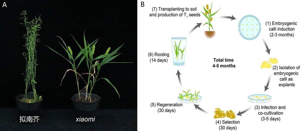 研究人员通过诱变筛选到一个超早熟突变体 xiaomi 。该突变体生育期仅2个月左右,株高仅30 cm左右,与模式植物拟南芥相当。在此基础上,组装了高质量参考基因组,构建了全生育期基因表达图谱和谷子多组学数据库(http://sky.sxau.edu.cn/MDSi.htm)。该研究还建立了一套方便快捷、高效稳定的农杆菌介导的 xiaomi 遗传转化体系,该体系遗传转化效率高达23.28%,已经接近模式植物拟南芥和水稻遗传转化水平,从而解决了 xiaomi 作为模式植物进行功能基因组学研究的最大障碍。类似拟南类芥的超短生育期和株高以及上述资源和遗传转化体系,使得 xiaomi 成为C4禾谷类研究的理想模式植物体系。该体系的建立必将极大促进C4高光效、氮素高效吸收利用机制、抗旱机制、遗传驯化和优异品质形成的分子基础等研究。