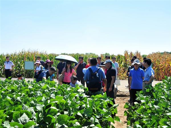 在廊坊试验基地,重点考察了玉米小双行增密、推茬清垄播种等绿色高产增效栽培技术。小双行错位密植栽培新技术,可以有效地提高群体容量约500株,产量提高10%左右,该新型种植方式与自行研发的配套机械结合形成玉米推茬清垄播种一体化技术体系,可同时实现推茬、清垄、深施肥、小双行密植精播效果,实现了农机与农艺的结合,有效地解决了夏玉米播种时前茬小麦秸秆量大,播种困难,出苗不整齐等问题,目前该技术体系已在北京通州,吉林长春、天津等地进行推广应用,增产效果显著。