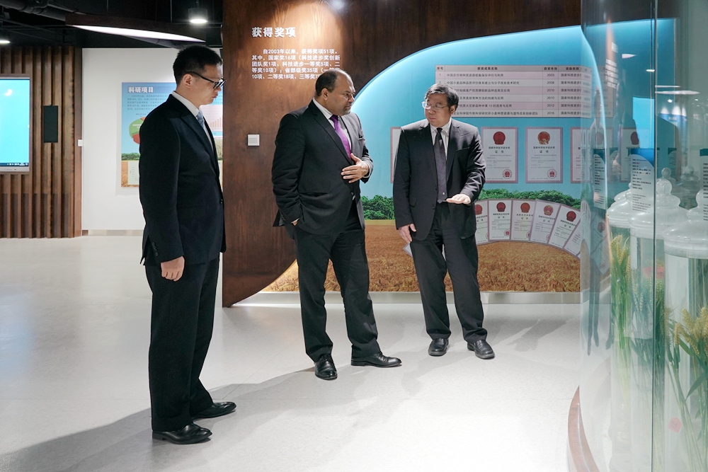 阿布拉扎克处长考察了作科所展厅和国家农作物航天诱变技术改良中心,作科所副所长刘录祥研究员对肖卡特·阿布拉扎克来访表示欢迎,介绍了作科所总体情况以及近年来在作物航天诱变、地面模拟诱变新因素开发等新技术新方法研究与应用、小麦突变新材料创制及航麦247、航麦2566和鲁原502等小麦新品种培育与推广利用、牵头IAEA植物诱变育种技术合作项目以及承接IAEA植物诱变育种技术地区和跨地区培训班、科访和进修等情况。