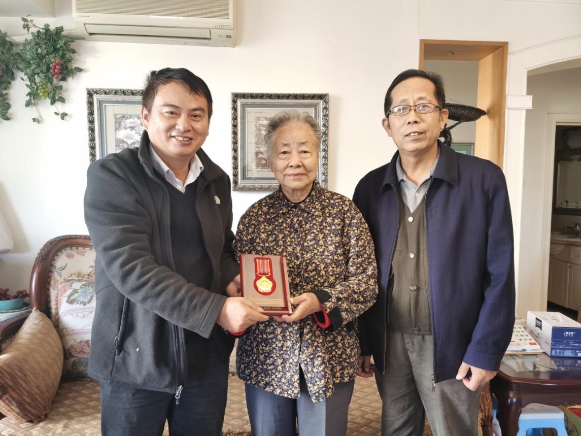 范静书记亲自为刘淑慧老师戴上纪念章,送上慰问品,仔细询问身体和生活情况,与她促膝交谈,认真聆听抗美援朝的革命故事,对他们为科研事业做出的贡献表示衷心感谢和崇高敬意,祝福他们健康长寿、生活幸福。