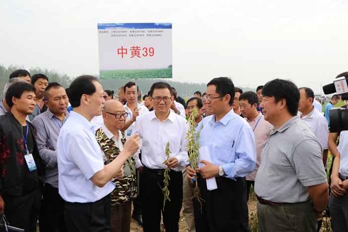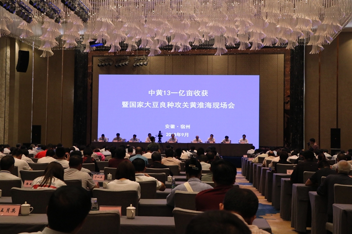 2018年9月21日,由中国农业科学院作物科学研究所和宿州市人民政府共同主办的“中黄13一亿亩收获暨国家大豆良种攻关黄淮海现场会”在安徽省宿州市召开。我国大豆产业发展进入里程碑阶段,优质大豆品种中黄13喜迎累计种植面积第一亿亩收获,国家大豆良种重大科研联合攻关效果显著。农业农村部副部长余欣荣,中国农科院党组书记张合成、副院长万建民院士,中国工程院盖钧镒院士等领导和专家出席会议。
