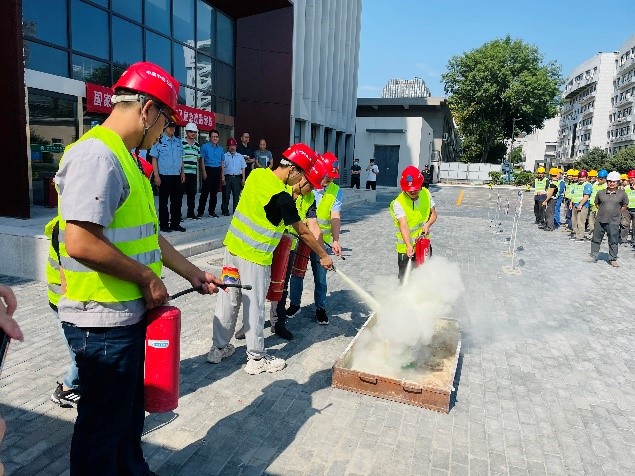 活动邀请大钟寺派出所安永慧警官结合项目施工工地生产作业环境复杂、工人流动性强及大多数施工人员的消防安全意识较为淡薄等情况,讲解了建筑工地消防安全特点、施工中防火等注意事项,并为参训人员现场示范了灭火器、消防水枪、水带消防器材使用及火灾现场逃生技巧等。