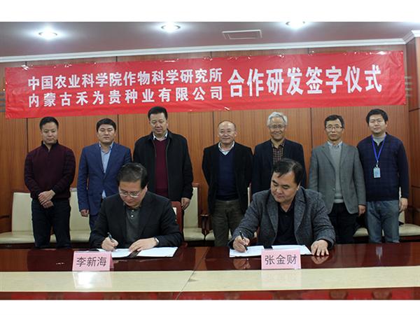 2017年2月8日,中国农业科学院作物科学研究所李新海副所长代表作科所与内蒙古禾为贵种业有限公司签订了合作研发协议,开启了我所在全国谷子主产区开展成果转化,直接服务三农的合作研发新模式。党委书记孙好勤,科研处吴赴清副处长及谷子糜子产业技术体系首席刁现民研究员等人出席了签约仪式。