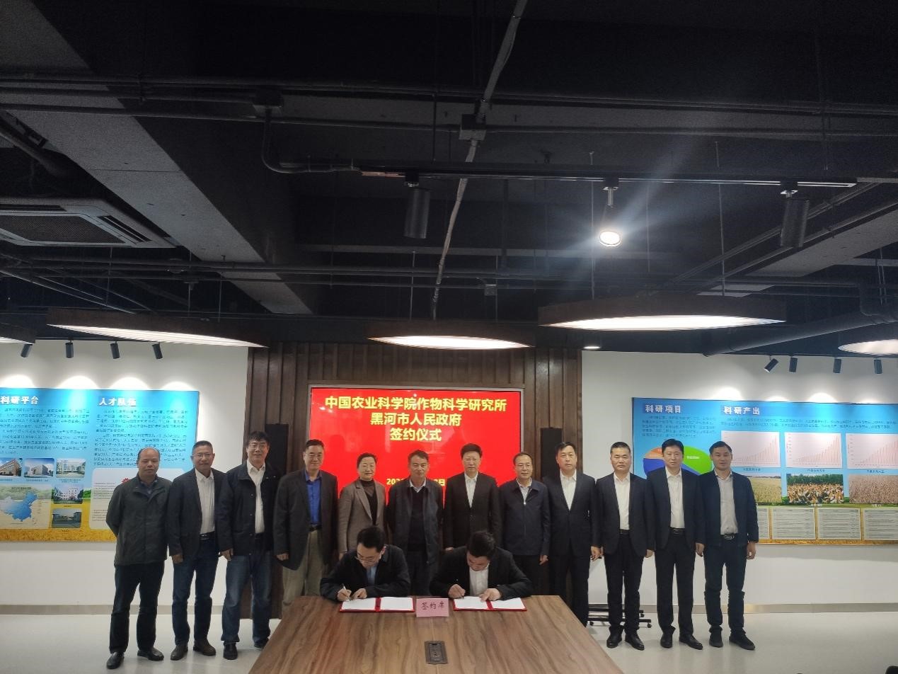 10月18日,中国农业科学院作物科学研究所与黑河市人民政府正式签署战略合作框架协议,双方将共建中国农科院作科所黑河大豆研究中心。所长钱前院士、党委书记范静和黑河市市长王玉升出席签约仪式,作科所党委副书记马秀勇和黑河市副市长张建国分别代表双方签约。签约前,中国农科院党组书记张合成会见了王玉升一行。