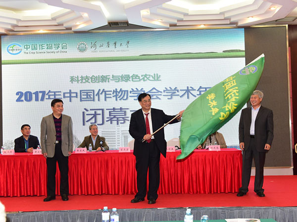 在闭幕式上,本次年会的承办方河北农业大学副校长马峙英将“中国作物学会学术年会的会旗”交到中国作物学会理事长翟虎渠手中,翟虎渠理事长又将年会会旗郑重的交到下届年会的承办方扬州大学黄建晔副校长的手中,黄建晔副校长代表下届年会承办方作了发言,他充分肯定了本次会议的重要性和所取得的成绩,并向与会代表介绍了扬州大学和扬州这座美丽的城市,他热情的邀请与会代表继续支持和参加2018年中国作物学会学术年会,期待大家明年10月相聚在扬州。