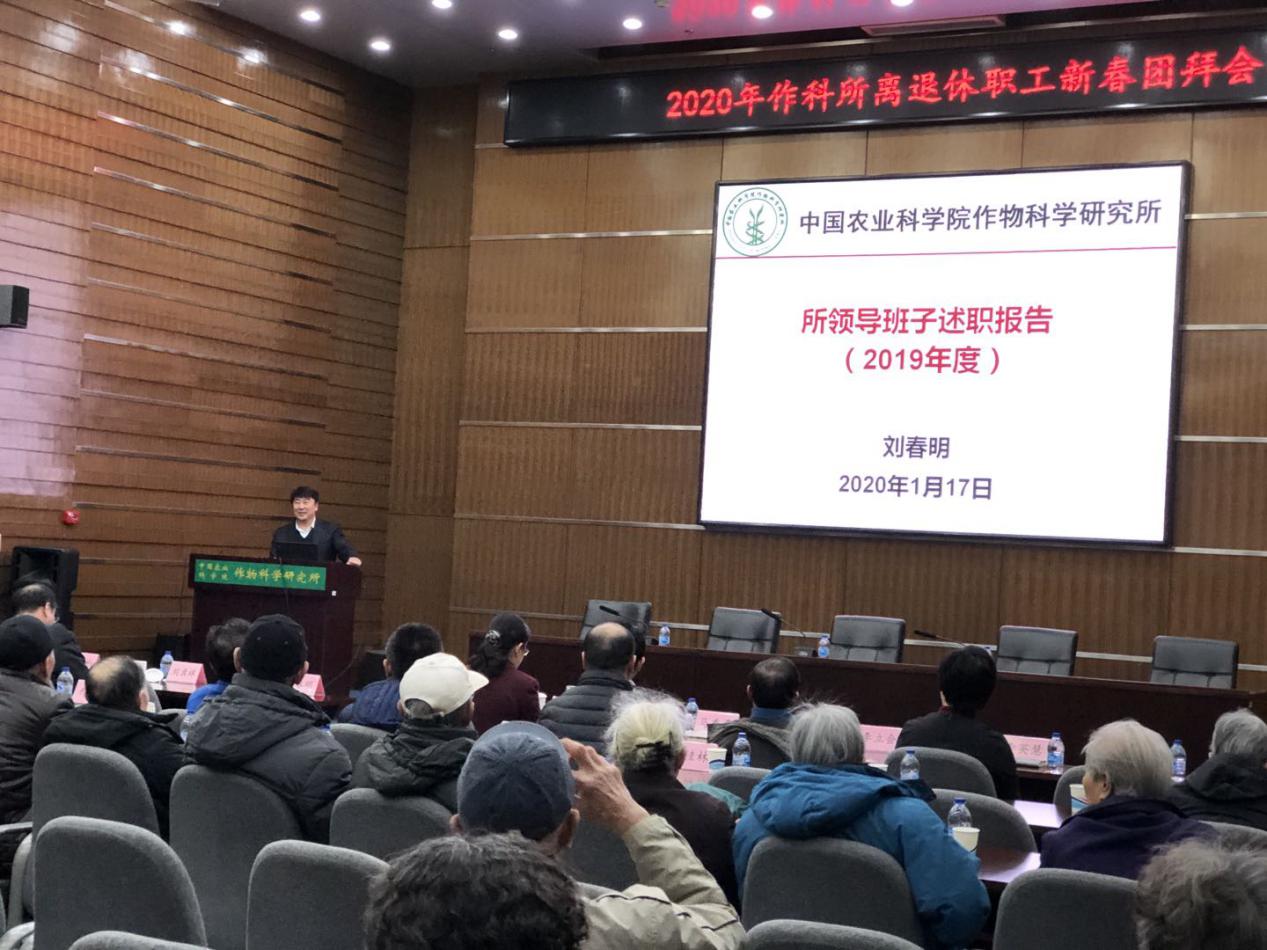 刘所长以“数说2019”开篇,向离退休老同志汇报了研究所2019年科研立项与重要成果产出、科技创新主要进展、人才队伍建设、科研条件建设、学术交流、管理机制等工作。他指出,作科所连续第八年获得研究所评价发展实力排名第一的好成绩与老同志的支持和优良传承是分不开的,离退休老同志是作科所宝贵的财富,他们的奋斗精神将激励在职职工继续努力,永攀高峰。范静书记重点汇报了研究所2019年党建工作、脱贫攻坚、精神文明建设以及党风廉政方面的情况。最后,刘春明和范静携各部门和研究中心负责人给全体离退休职工拜年,祝大家新年快乐,身体健康,万事如意!