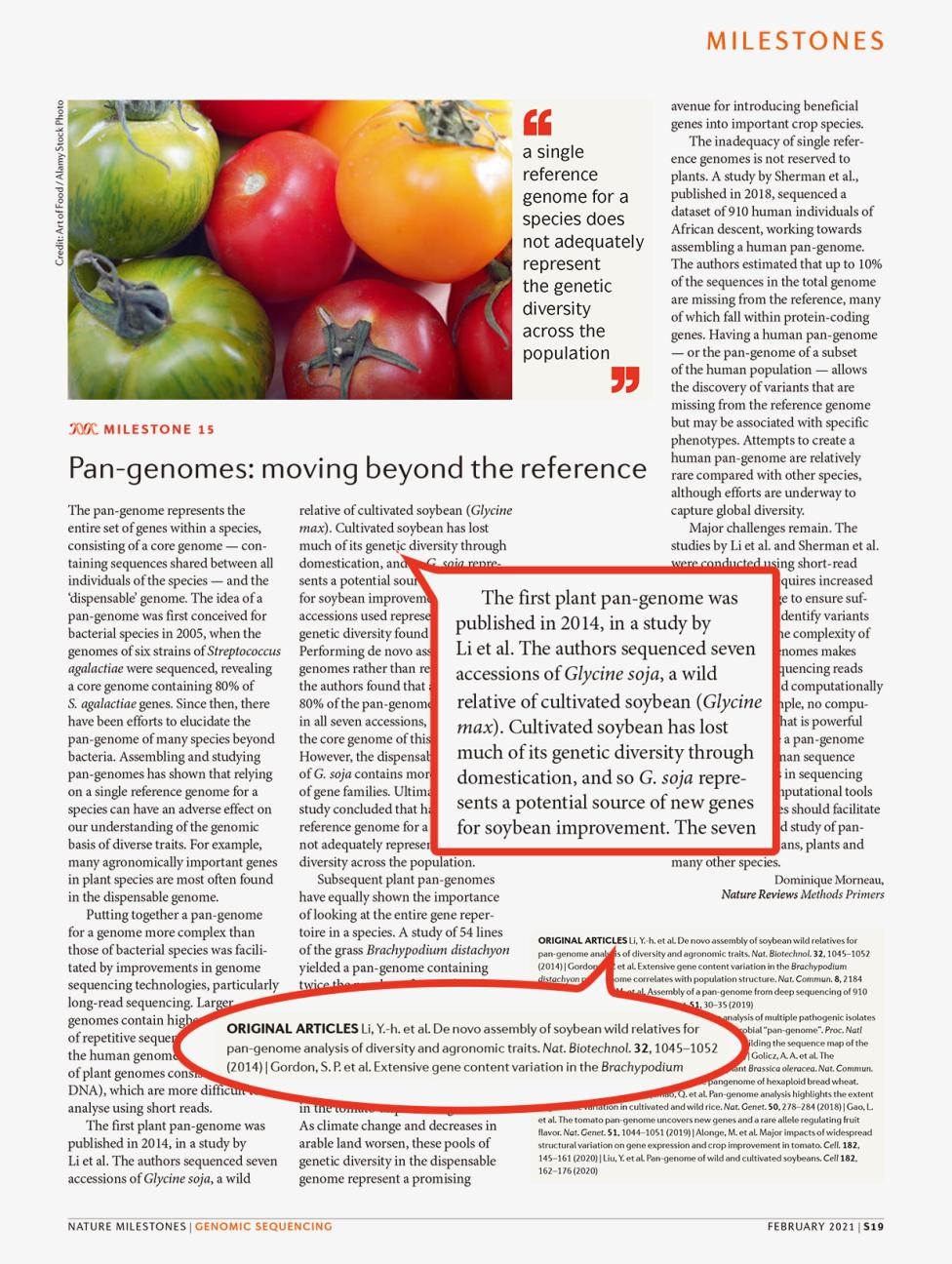 近日,在第一版人类基因组序列图谱发布20周年之际,《自然》杂志在线发布了20年来测序技术的发展历程和17个重要里程碑事件,中国农业科学院作物科学研究所邱丽娟研究团队于2014年9月14日发表在《Nature Biotechnology》上的“一年生野生大豆的泛基因组构建”相关研究入选。该研究在国际上率先构建和分析了第一个植物泛基因组,开启了动植物泛基因组研究历程。文章截止目前引用次数已高达364次(引用数字来自谷歌学术),为后续动植物领域泛基因组的研究发展,提供了方法和启示,具有里程碑意义。