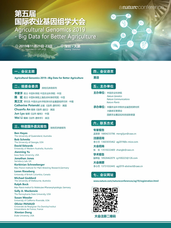 由中国农业科学院、Nature Genetics、Nature Communications、Nature Plants主办,中国农业科学院农业基因组研究所、大鹏新区管委会和国家农业基因组科技创新联盟共同承办的第五届国际农业基因组学大会将于2019年11月21-23日在深圳举行。届时,大会将搭建农业基因组学领域的国际交流平台,邀请汇聚国内外知名科学家,共同探讨基因组学在农业中的应用和发展方向。第五届国际农业基因组学大会将是一场智慧和知识的盛宴,观点新颖、见解犀利、思想碰撞、信息共享!