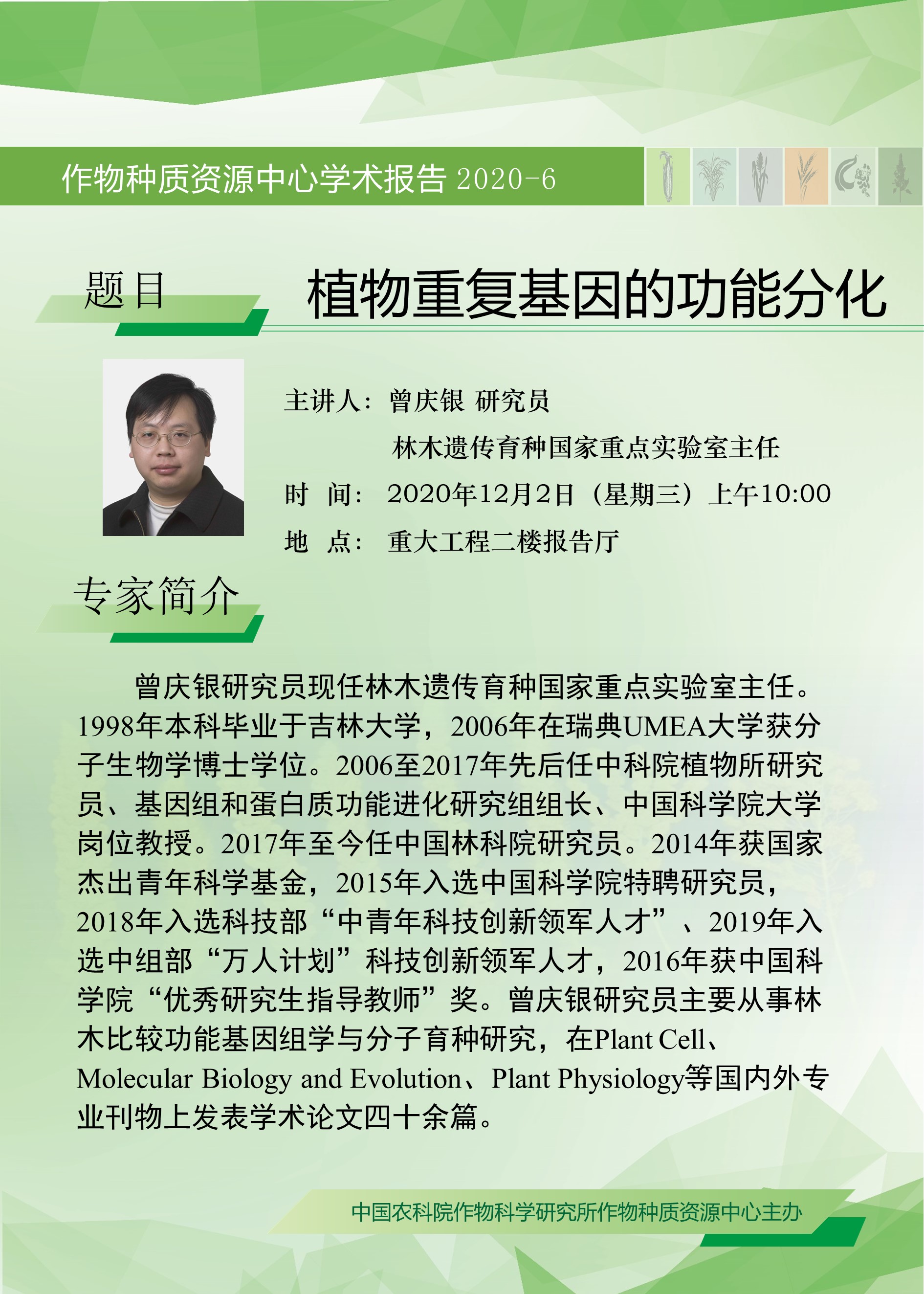 曾庆银研究员 植物重复基因的功能分化(种质资源中心学术报告2020-6)