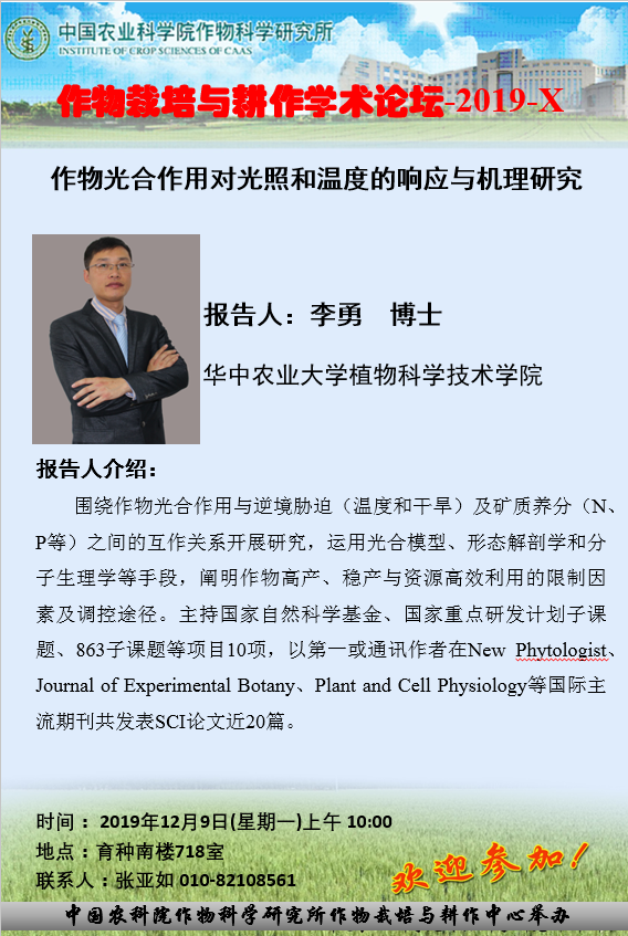 李勇博士 作物光合作用对光照和温度的响应与机理研究(作物栽培与耕作学术论坛 2019-10)