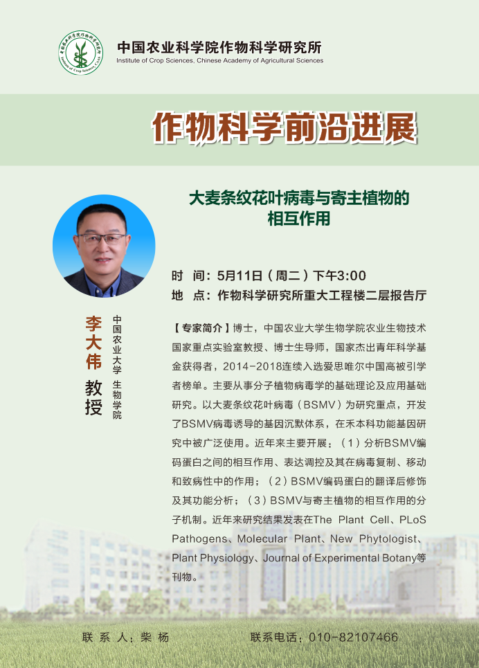 【作物科学前沿进展】李大伟教授 大麦条纹花叶病毒与寄主植物的相互作用(5月11日)
