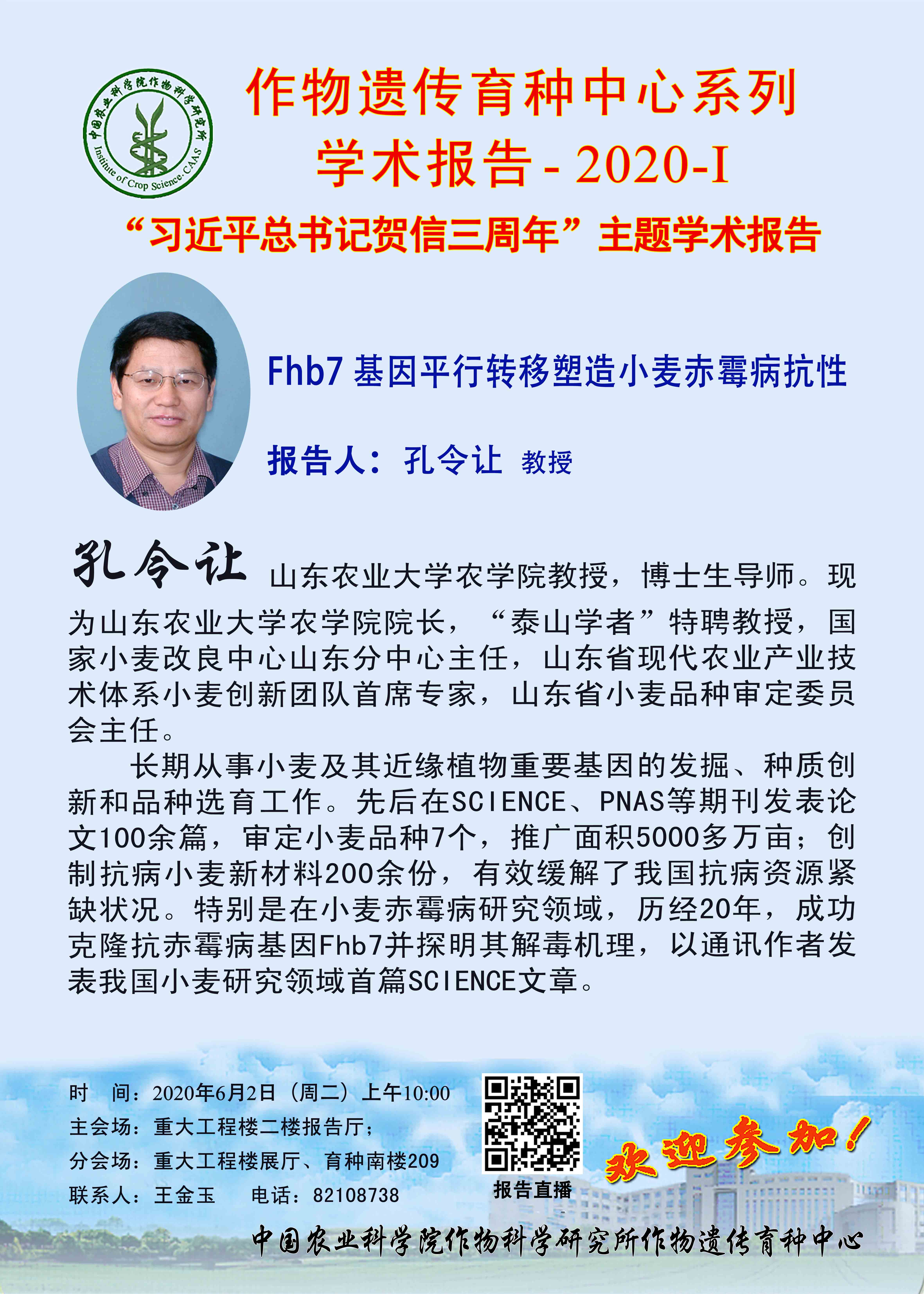 孔令让 教授, Fhb7基因平行转移塑造小麦赤霉病抗性(育种中心系列学术报告2020-1)
