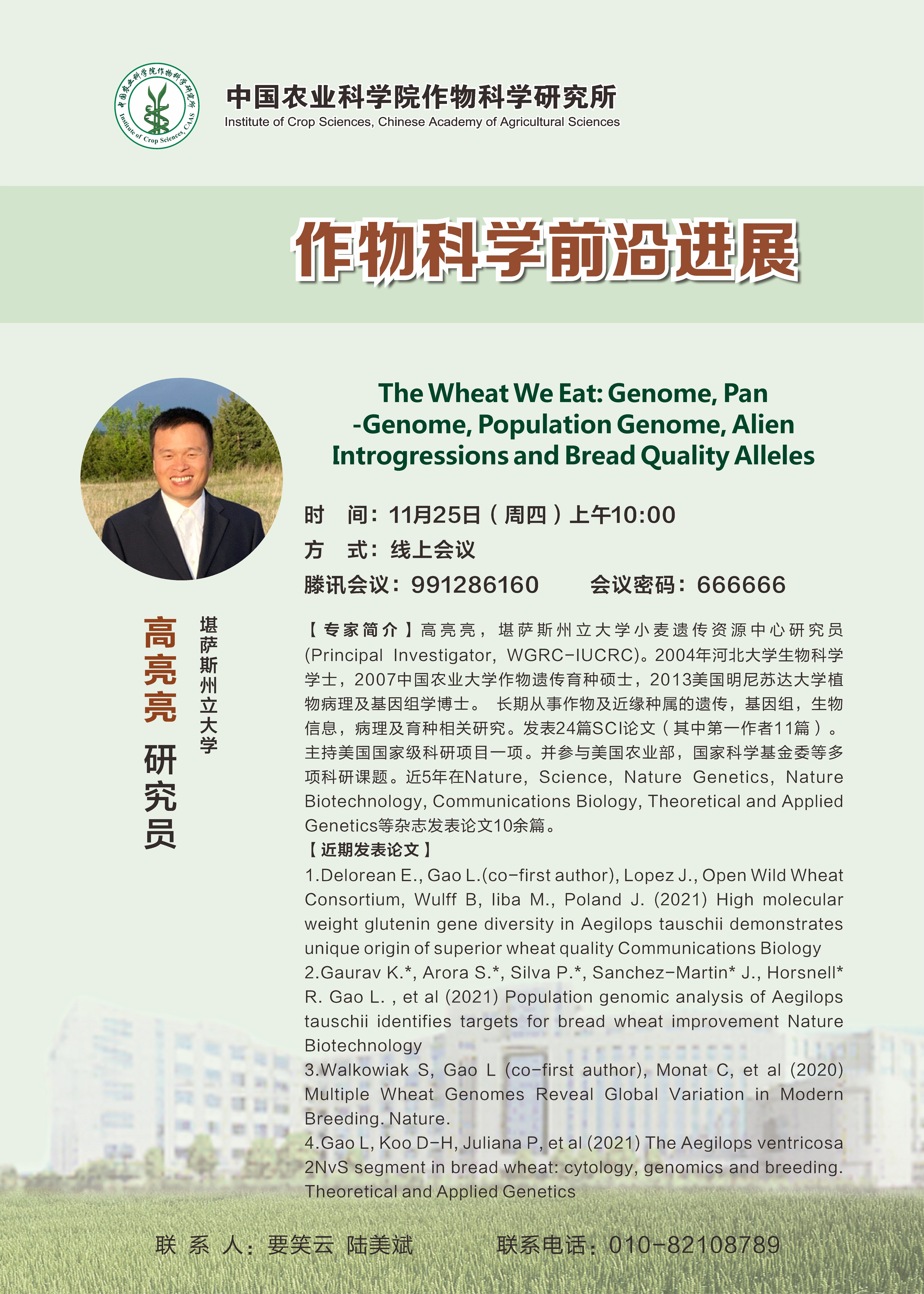 【作物科学前沿进展】高亮亮 The Wheat We Eat: Genome, Pan-Genome, Population Genome, Alien Introgressions and Bread Quality Alleles
