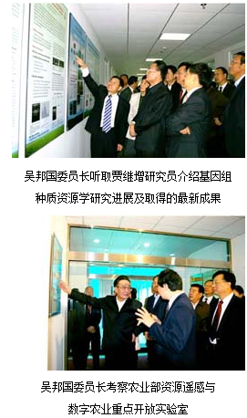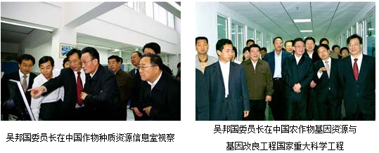 种质信息系统数据库的全部过程,并亲自走进零下18度的长期库。当得知国家长期库中保存的种质资源的数量居世界首位时,吴邦国委员长高兴地说:“种质资源是国家的宝贵财富,不仅要继续收集国内的种质资源,还要多收集国外的资源,要把中国从资源的富国变为基因的强国。”