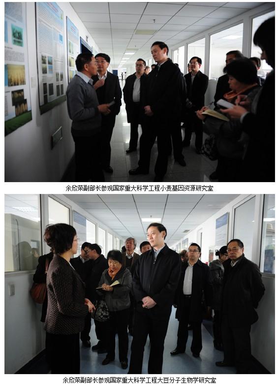 余欣荣副部长先后考察了国家农作物种质资源长期库;国家农作物基因资源与基因改良重大科学工程公共开放实验室、小麦基因资源研究室、转基因小麦研究室、水稻和大豆分子生物学研究室,并听取了相关科研进展情况汇报。