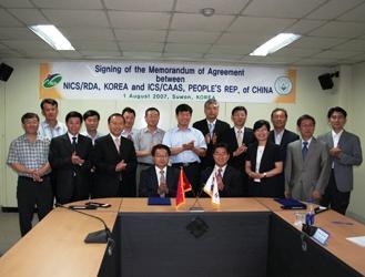 2007年8月1日,中国农业科学院作物科学研究所与韩国农村振兴厅作物科学院科技合作备忘录签字仪式在韩国水原市举行。所长万建民博士和韩国农村振兴厅作物科学院院长金皓瑛博士分别代表双方在备忘录上签字。