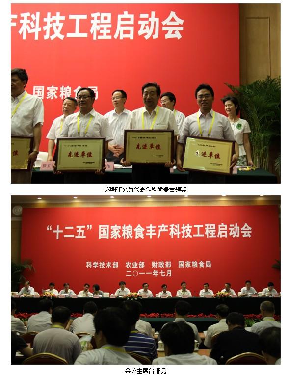 会议全面总结了“十一五国家粮食丰产科技工程”的实施成效与经验,进一步部署了“十二五”粮食丰产科技工作。科技部、农业部、财政部、国家粮食局与13个实施省分别签署了“十二五”国家粮食丰产科技工程实施协议。会上还对“十一五”工程实施先进集体和个人进行了表彰,中国农业科学院作物科学研究所由于在“粮丰工程”实施过程中组织科学、措施得力、成果显著,获得了“先进单位”的称号,赵明研究员代表我所领取获奖证书。